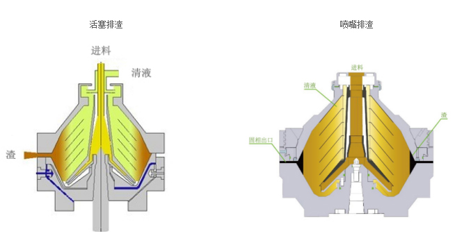 電機(jī)通過螺旋齒輪副驅(qū)動轉(zhuǎn)鼓繞主軸軸線做高速旋轉(zhuǎn),在轉(zhuǎn)鼓內(nèi)形成強(qiáng)大的離心力場。物料由上部中心進(jìn)料管流入轉(zhuǎn)鼓底部,通過碟片分流孔趨向轉(zhuǎn)鼓壁空間。在離心力作用下,液相沿碟片內(nèi)錐面趨向轉(zhuǎn)鼓壁流動至上部的出液口排出。比液相重的固相物沉積向轉(zhuǎn)鼓內(nèi)壁形成沉渣,由排渣裝置自動排出機(jī)外或停機(jī)后由人工清除。