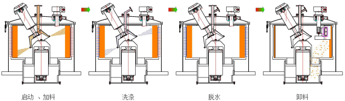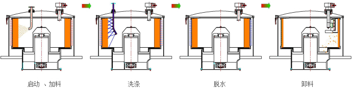 電機帶動皮帶輪驅(qū)動轉(zhuǎn)鼓繞自身軸線高速回轉(zhuǎn),物料在預先編制的程序控制下,通過進料系統(tǒng)進入高速旋轉(zhuǎn)的轉(zhuǎn)鼓內(nèi)。在離心力的作用下,物料均布在過濾介質(zhì)上進行脫液分離,液相透過固相物料和濾網(wǎng)縫隙,經(jīng)鼓壁孔甩至機殼空間,從出液口排出機外,固相物料截留在轉(zhuǎn)鼓內(nèi)形成濾餅。料層檢測裝置實時檢測物料的充填位置,當濾餅達到事先設定的位置時,自動關(guān)閉加料閥,停止進料,然后對濾餅進行洗滌、脫水,待達到要求后,離心機降到卸料速度,刮料器在液(氣)動控制下將濾餅刮下,經(jīng)轉(zhuǎn)鼓底上的出料口卸出。