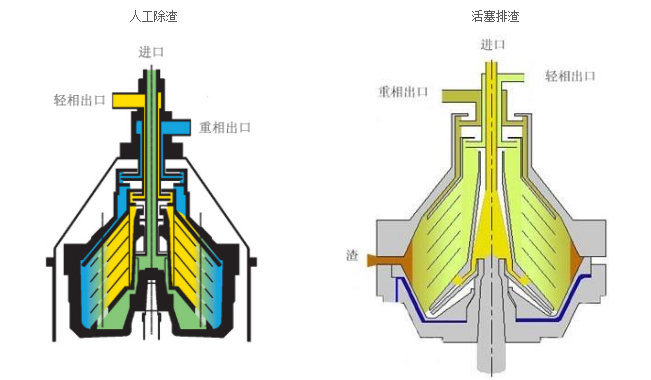 電機(jī)通過螺旋齒輪副驅(qū)動(dòng)轉(zhuǎn)鼓繞主軸軸線做高速旋轉(zhuǎn),在轉(zhuǎn)鼓內(nèi)形成強(qiáng)大的離心力場(chǎng)。物料由上部中心進(jìn)料管流入轉(zhuǎn)鼓底部,通過碟片分流孔趨向轉(zhuǎn)鼓壁空間。在離心力作用下,輕液沿錐形碟片外錐面向軸心流動(dòng)至上部由輕液口排出。重液沿碟片內(nèi)錐面趨向轉(zhuǎn)鼓壁流動(dòng)至上部的重液口排出。比液相重的固相物沉積向轉(zhuǎn)鼓內(nèi)壁形成沉渣,由排渣裝置自動(dòng)排出機(jī)外或停機(jī)后由人工清除。